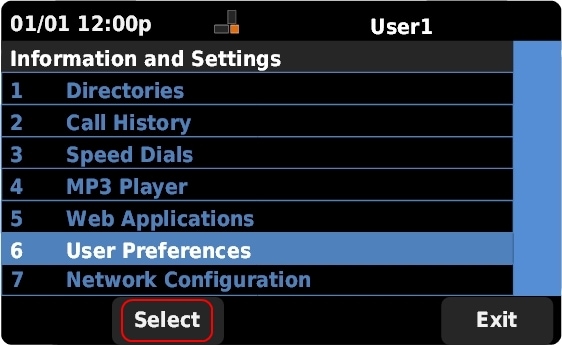 Étape 2. Faites défiler vers le haut et vers le bas avec les touches de navigation pour sélectionner Préférences utilisateur. Appuyez sur Sélectionner pour afficher le menu Préférences utilisateur.