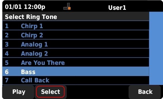 Étape 5. Faites défiler la liste vers le haut et le bas avec les touches de navigation pour sélectionner une sonnerie. Appuyez sur Lire pour écouter la sonnerie sélectionnée. Appuyez sur Sélectionner pour sélectionner la sonnerie sélectionnée.