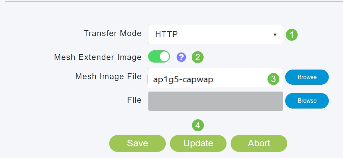 Sélectionnez HTTP comme mode de transfert. Activez l'image Mesh Extender. Ajoutez le fichier sous la forme ap1g5-capwap à partir de votre PC. La mise à jour du premier extendeur de maillage via HTTP nécessite au moins l'installation de la version 10.3.1.0 du microprogramme sur le point d'accès principal.