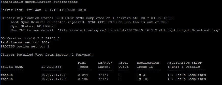 - Pour valider si la réplication est entièrement établie, exécutez cette commande : utils dbreplication runtimestate
