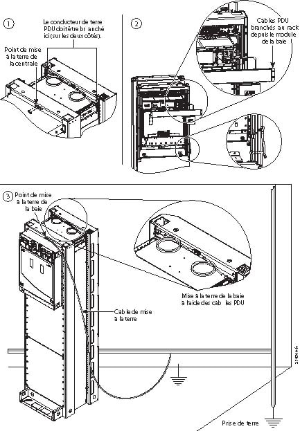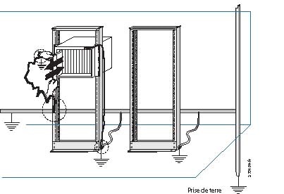 Assurez-vous que le conducteur de terre du bureau est branché à la partie supérieure de la baie et à la prise de terre de la centrale, conformément aux règles propres au site en question. Reportez-vous à la Figure 1 et à la Figure 2.