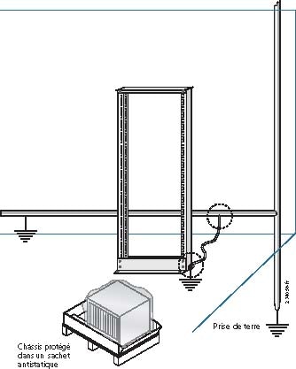 Cette section décrit comment procéder pour relier correctement le boîtier du bâti à la prise de terre du bâtiment. Elle illustre également comment maintenir le châssis dans un sachet antistatique fermé hermétiquement, jusqu'à son installation effective. (Reportez-vous à la Figure 2.)
