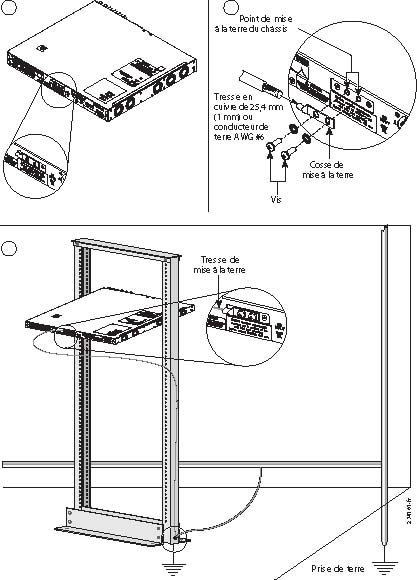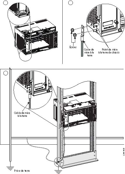 Préparez l'autre extrémité du câble de mise à la terre et connectez-le au point de mise à la terre approprié de votre site pour garantir une mise à la terre adéquate du châssis. (Reportez-vous au schéma 3 à la Figure 9.)