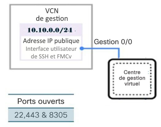 Firewall Management Center Virtual exécute le même logiciel que les On-Prem Firewall Management Center physiques afin d’offrir des fonctionnalités de sécurité éprouvées dans un format virtuel. Firewall Management Center Virtual peut être déployé dans le GCP public. Il peut ensuite être configuré pour gérer les périphériques virtuels et physiques.