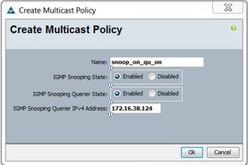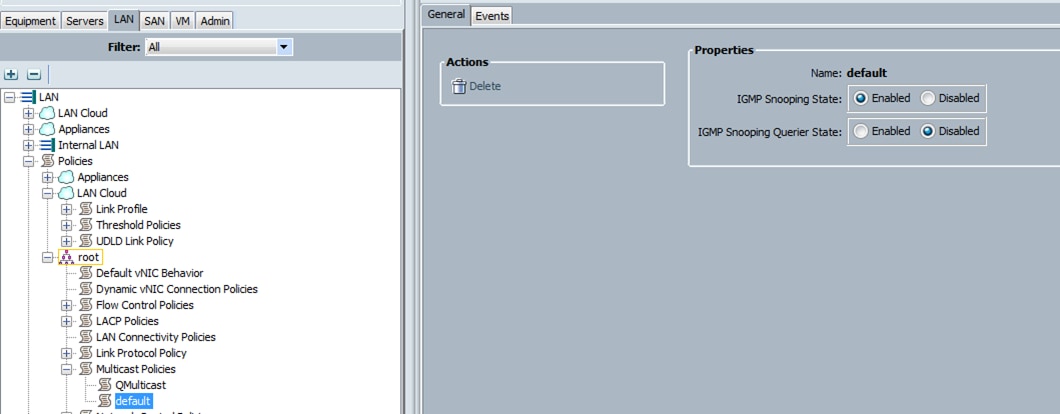 Lo snooping IGMP è disponibile su base VLAN e non a livello di interfaccia. Da UCSM, questa può essere configurata con un criterio multicast su una VLAN denominata.