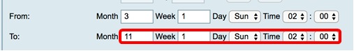 Passaggio 14. Nell'area A, impostare il mese, il giorno e l'ora nei rispettivi campi per impostare la data di fine dell'ora legale.