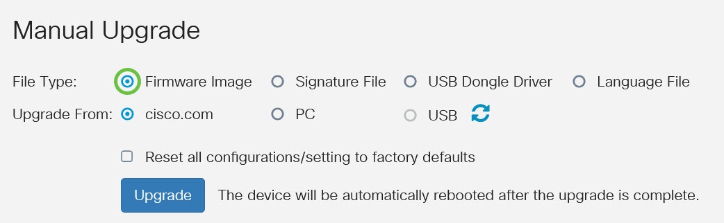 Nell'area File Type in Manual Upgrade (Aggiornamento manuale), fare clic sul pulsante di opzione Firmware Image (Immagine firmware). Per scaricare un tipo di file diverso per un aggiornamento diverso, fare clic su un pulsante di opzione. Le opzioni sono: