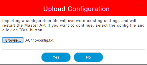Viene visualizzata una schermata di popup che richiede di confermare con un avviso che l'importazione di un file di configurazione sovrascriverà le impostazioni esistenti e riavvierà l'access point primario. Fare clic su Sì.