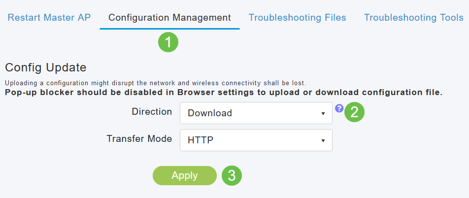 Fare clic sulla scheda Gestione configurazione. Fare clic sul menu a discesa Direzione per selezionare Scarica. Lasciare la modalità di trasferimento su HTTP. Fare clic su Apply (Applica).