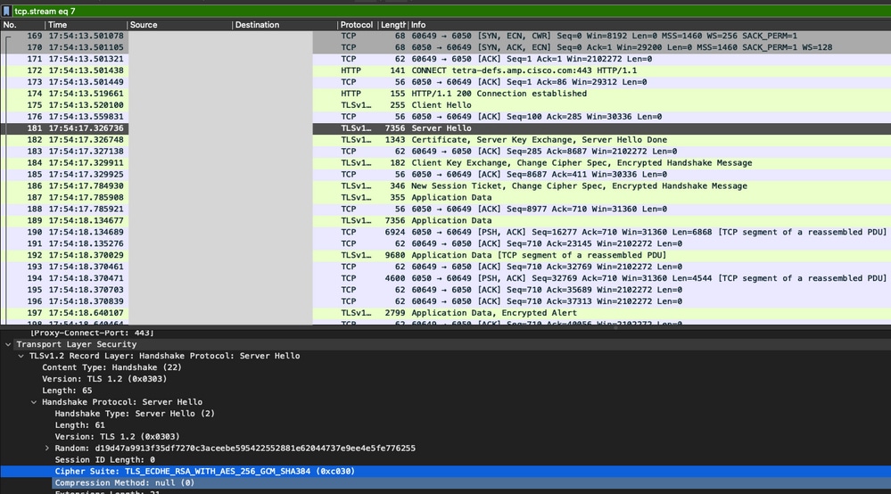 - In caso di aggiornamento TETRA dell'endpoint riuscito, filtrare i pacchetti con http.host == "tetra-defs.amp.cisco.com:443" e quindi "seguire il flusso tcp.stream" di ciascun pacchetto per analizzare il traffico correlato.