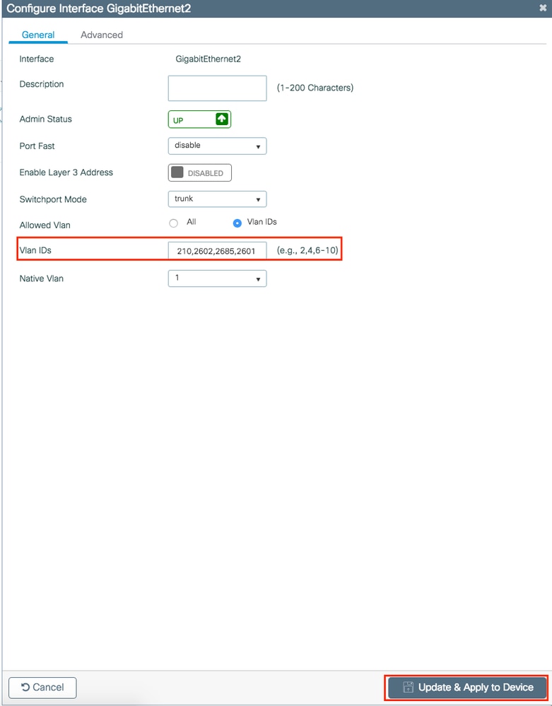 Se non si stanno utilizzando i canali delle porte, selezionare Configurazione > Interfaccia > Ethernet > Nome interfaccia > Generale. Se viene visualizzata la configurazione Allowed Vlan = All, la configurazione è stata completata. Se viene visualizzato Allowed VLAN = Vlan ID, aggiungere le VLAN necessarie e fare clic su Update & Apply to Device (Aggiorna e applica al dispositivo).