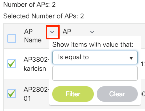 Fare clic sull'icona Tag AP:=. Selezionare l'elenco di punti di accesso a cui si desidera assegnare i tag (è possibile fare clic sulla freccia rivolta verso il basso accanto a Nome punto di accesso [o qualsiasi altro campo] per filtrare l'elenco di punti di accesso).