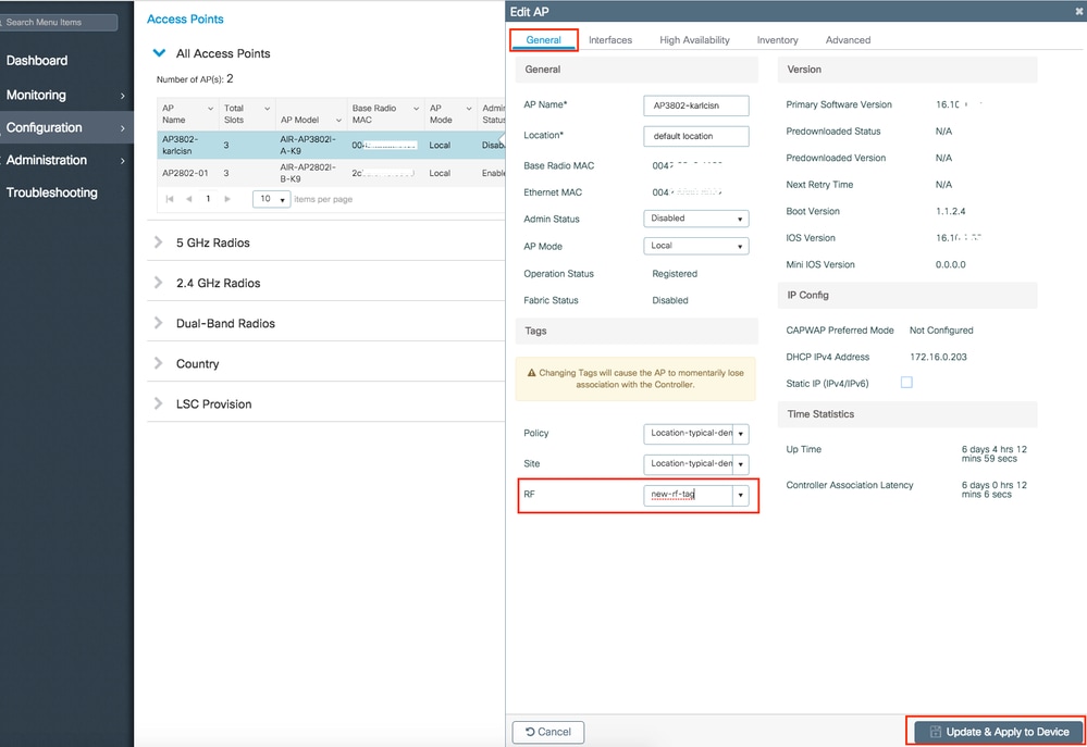 Selezionare Configurazione > Wireless > Access Point > Nome access point > Generale > Tag. Dall'elenco a discesa Sito, selezionare il tag RF desiderato e fare clic su Aggiorna e applica alla periferica.