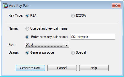 Enter new key pair nametheradio」ボタンをクリックします。認識できるように、キーペアの名前を特定します。Key Size。withGeneral Purpose for Usage RSAを選択します。Generate Nowキーペアが作成されます。Select,、次の表に表示されている属性を設定します。