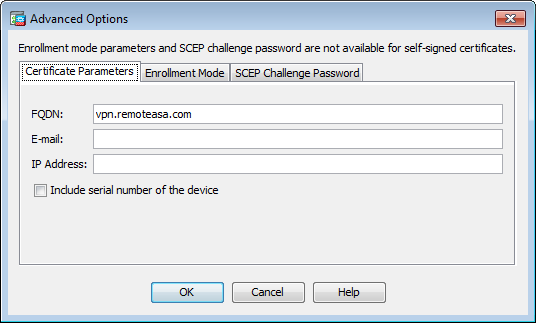 3. 「信頼できない証明書(Untrusted Certificate)」の警告が出されないようにし、厳密な証明書のチェックに合格するためには、CSR の FQDN フィールドの ASA の DNS 名を使用します。