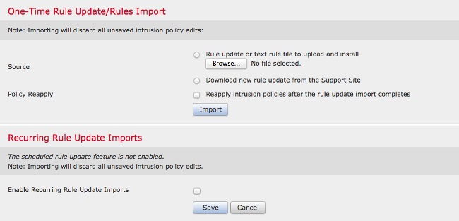 - IPS によって割り当てられた SID と、現在のリビジョン番号より後のリビジョン番号を使用してルールをインポートすることにより、削除したローカル ルールを復元することができます。ローカル ルールを削除すると、FireSIGHT Management Center は自動的にリビジョン番号を増やすことに注意してください。これは、ローカル ルールを復元できるようにするための方法です。