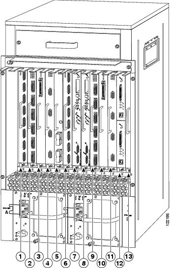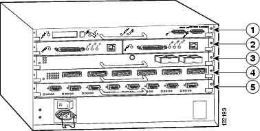 | 3.ポート アダプタ スロット 0 は、I/O コントローラ のファスト イーサネット ポート専用です(ある場合)。 4.スロット 1 は、スーパーバイザ エンジン専用です。冗長スーパーバイザ エンジンを使用する場合は、スロット 2 に挿入する必要があります。使用しない場合、スロット 2 はほかのモジュールに使用できます。 |
