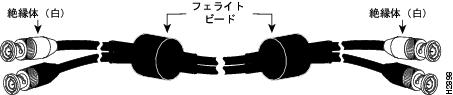 最初からフェライト ビードが取り付けられている 75 Ω 同軸ケーブル ペア(シスコ製品番号:CAB-ATM-DS3/E3)を発注することもできます(図1-5 を参照)。このタイプの 75 Ω 同軸ケーブルは、他のケーブル ベンダーでは市販されて いません 。