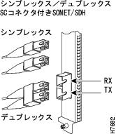 SDH シングルモードおよびマルチモード光ファイバ接続には、デュプレックス SC タイプ コネクタを 1 本(図1-5を参照)、またはシンプレックス SC タイプ コネクタを 2 本(図1-6を参照)使用します。