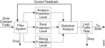 ゾーン保護がアクティブになると、ゾーン ポリシーによりゾーンのトラフィック フローが監視されます。ポリシーは、特定のトラフィック フローがポリシーのしきい値を超過すると、そのフローに対してアクションを実行します。実行するアクションは、通知の発行から、新しいフィルタ(動的フィルタ)の作成にまで及びます。このフィルタは、宛先変更されたトラフィックを関連する保護レベルに誘導するものです。Guard モジュールは、いくつかの認証方式を使用してトラフィックを認証します。Guard モジュールはトラフィック フローを分析し、ゾーンで対応可能な定義済みのレートを超えたトラフィックをドロップし、正当なトラフィックをゾーンに戻します。