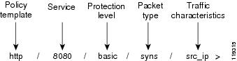 ポリシー名の最初の 4 つのセクション(ポリシー テンプレート、サービス、保護レベル、および パケット タイプ)は、分析されるトラフィックのタイプを定義します。ポリシー パスの最後のセクション(トラフィック特性)は、フローの分析方法を定義します。