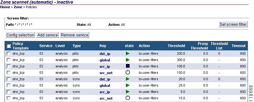 ゾーンのメイン メニューの Configuration > Policy を選択します。 Policies 画面が表示されます( 図 8-1 および 表 8-1 を参照)。
