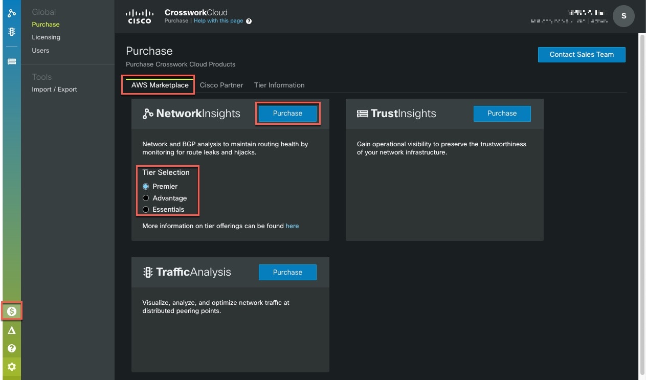 Crosswork Cloud Network Insights を購入する場合は、適切なライセンスの階層(Premier、Advantage、Essentials)を選択し、[購入(Purchase)] をクリックします。それ以外の場合は、Crosswork Cloud Trust Insights または Crosswork Cloud Traffic Analysis のいずれかの [購入(Purchase)] をクリックします。 AWS Marketplace ウェブサイトに移動します。 |