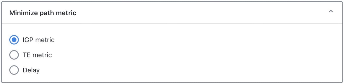 [パスメトリックの最小化(Minimize path metric)] セクションでは、インターフェイス IGP メトリック、インターフェイス TE メトリック、または回線遅延に基づいて SR LSP を最適化するかどうかを定義します。この最小化は、パスに沿ったメトリックの合計に対するものです。AS 間 SR LSP の場合、これらのメトリックは、AS ごとではなく LSP のエンドツーエンドで計算されることに注意してください。これらのプロパティは [インターフェイスの編集(Edit Interface)] ウィンドウから設定でき、遅延は [回線の編集(Edit Circuit)] ウィンドウで設定することもできます。