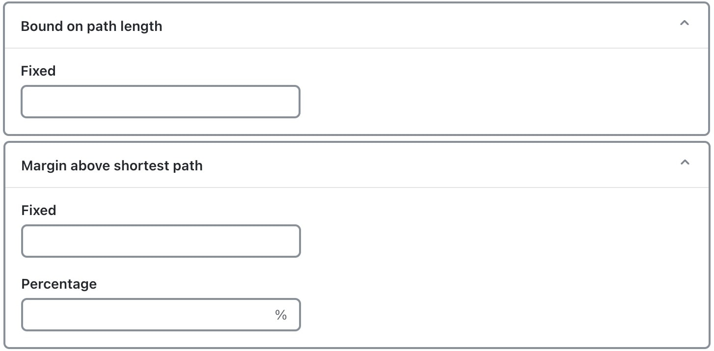 [パス長の境界(Bound on path length)] セクションと [最短パスを上回るマージン(Margin above shortest path)] セクションで、要件に応じて値を指定します。詳細については、境界とマージンを参照してください。 |