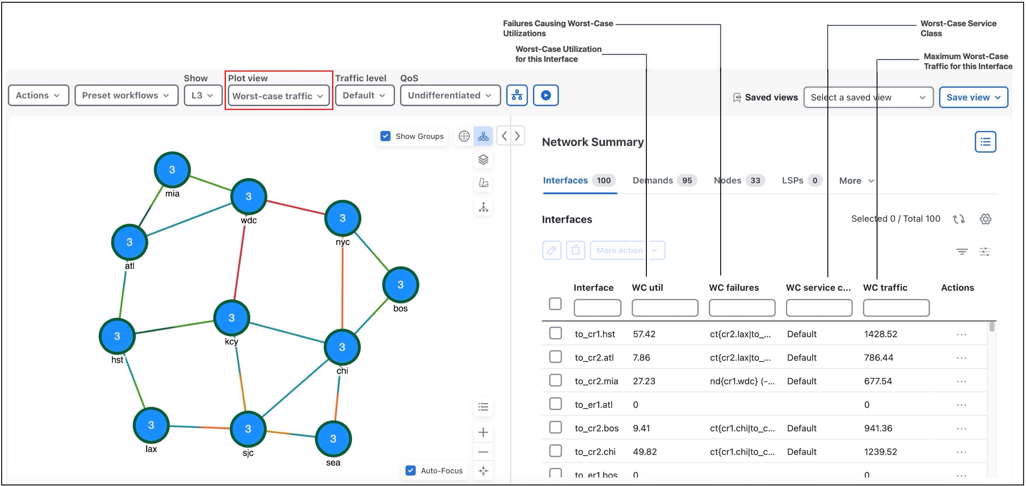 [ワーストケースのトラフィック(Worst-case traffic)] ビューで、それぞれのテーブルから目的のインターフェイスまたは回線を選択します。