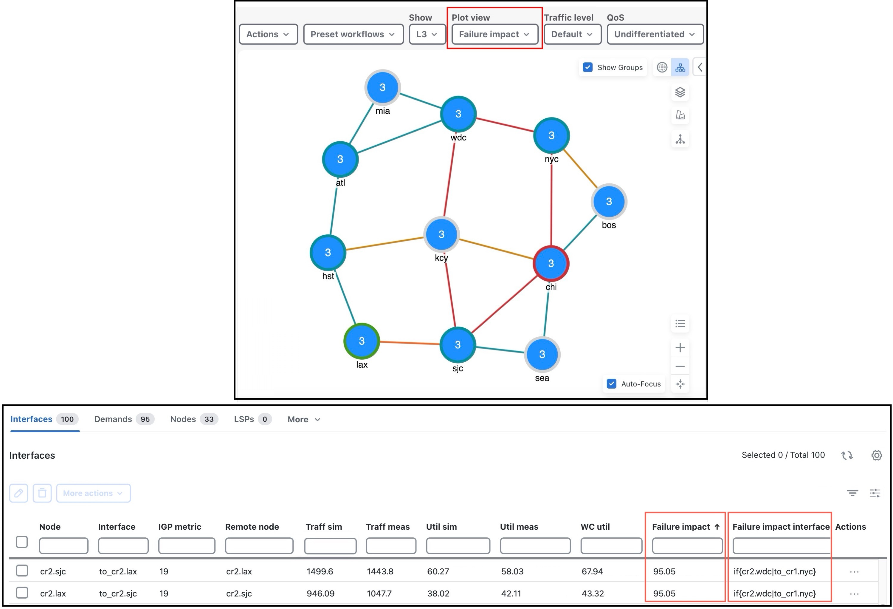 シミュレーション分析を実行(シミュレーション分析の実行を参照)した後、単一のインターフェイスでワーストケースの使用率またはワーストケースの QoS 違反を引き起こす各障害シナリオを選択的に表示するオプションがあります。