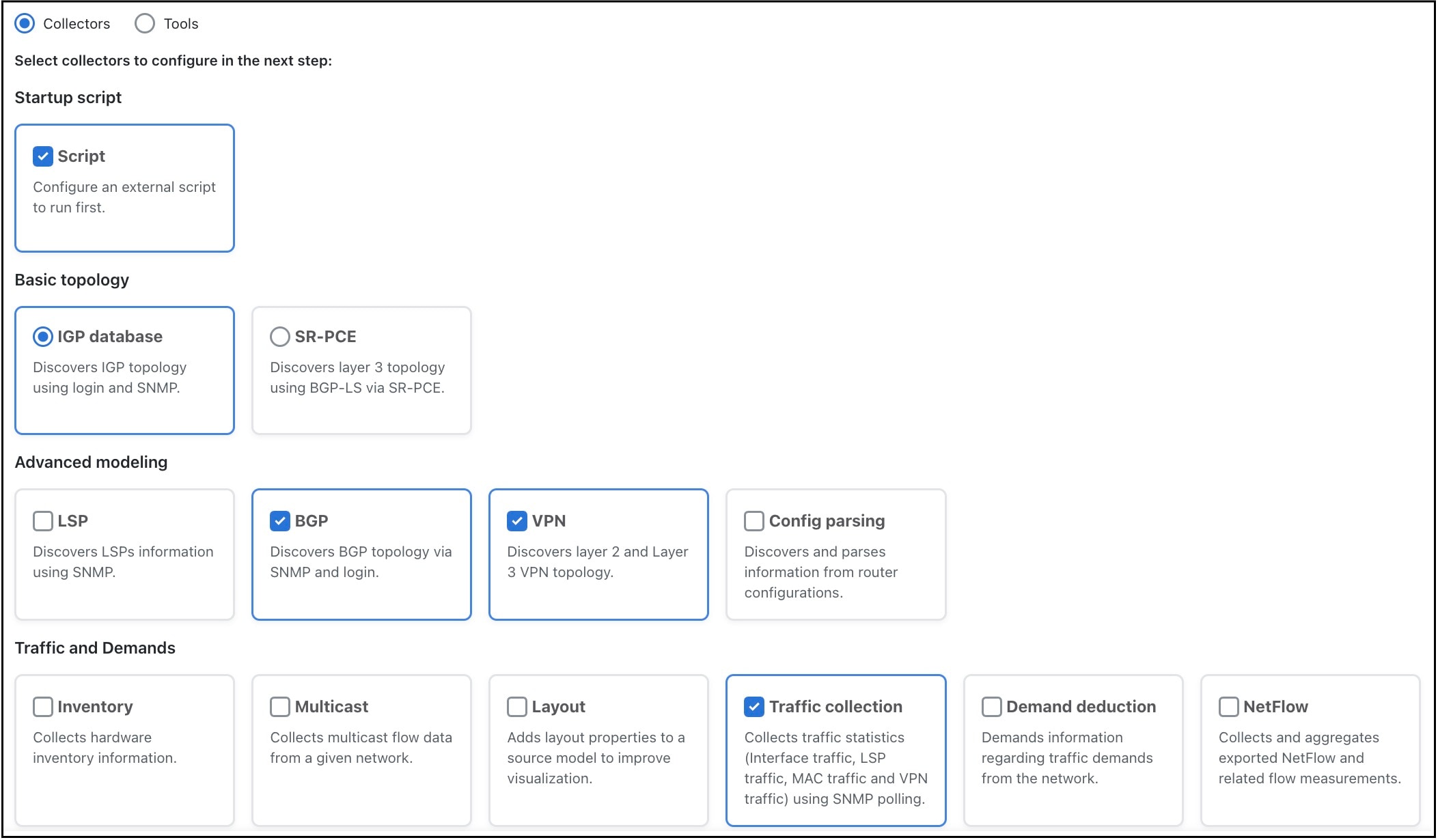 Cisco Crosswork Planning UI は、ネットワークのモデル構築チェーンを作成する複雑さを隠す、使いやすいインターフェイスを提供します。1 つのネットワーク(収集)にある複数のデータコレクタの設定をまとめて、統合されたデータを含む単一のネットワークモデルを生成できます。Cisco Crosswork Planning UI を使用して、デバイス、ネットワークアクセスを構成し、ネットワークモデルを作成し、ユーザーを管理し、エージェントを構成します。