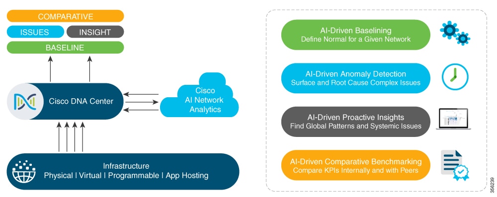 次の図とその後の情報で、Cisco AI Network Analytics の機能について説明します。