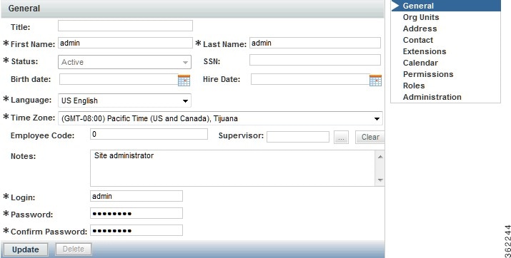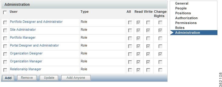 すべての組織エンティティに [管理(Administration)] ページがあります。 エンティティの [管理(Administration)] 部分では、そのエンティティ用に作成されたレコードの表示または編集を実行できるユーザを指定できます。