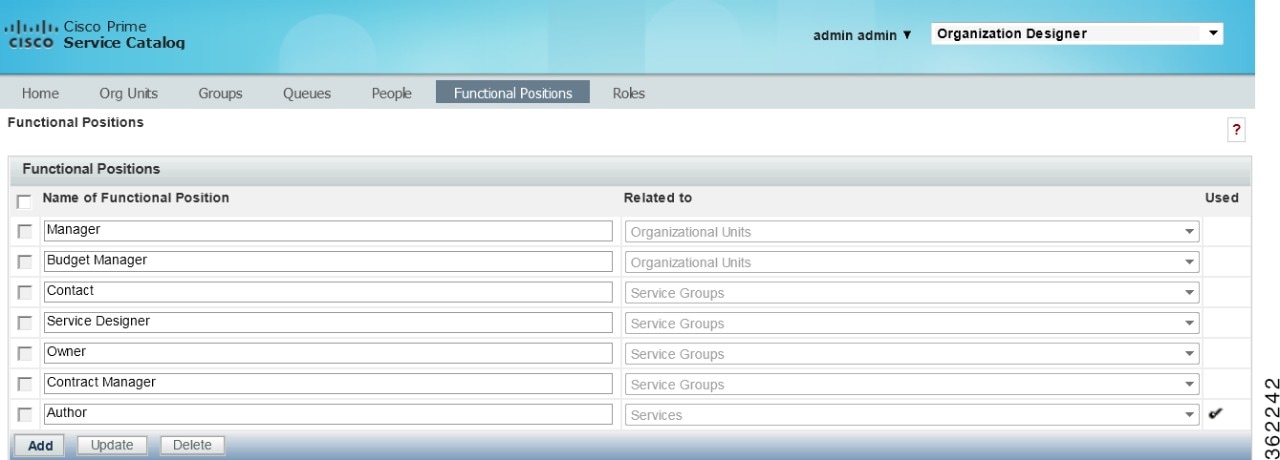 組織単位に関連付けられているキューまたは個人は、その組織のすべての役職に割り当てることができます。 エンティティを役職に割り当てる前に、役職が存在している必要があります。 Organization Designer には事前定義された役職が複数ありますが、役職を作成して組織単位に関連付けることもできます。