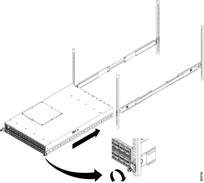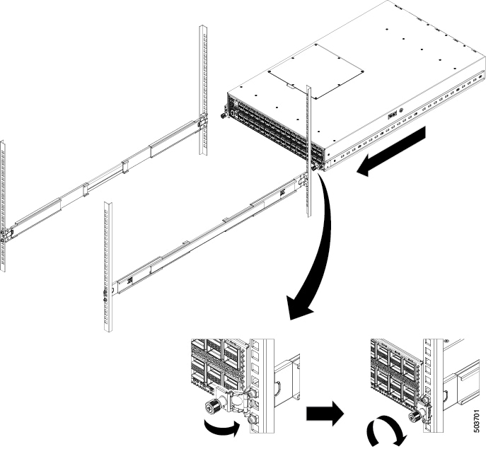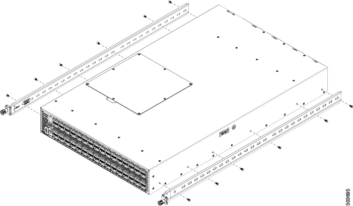 ラックマウント キットを使用すると、スイッチをさまざまな深さのラックに設置できます。ポート接続端またはファンおよび電源モジュールのいずれかに容易にアクセスできるようにスイッチを配置できます。