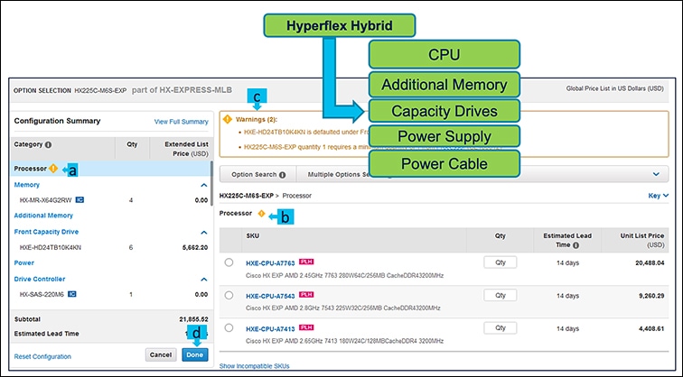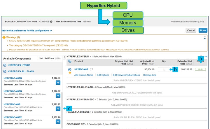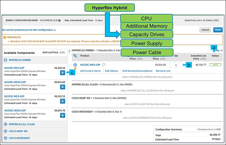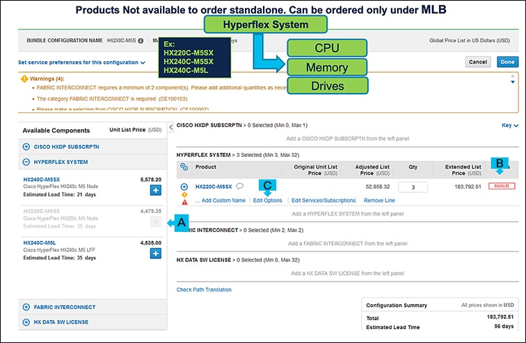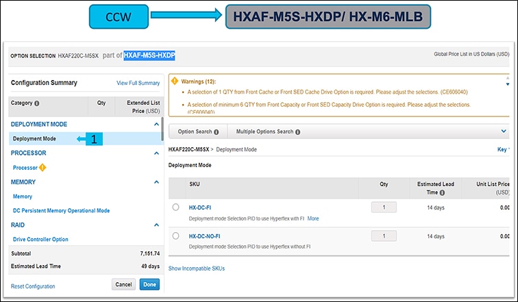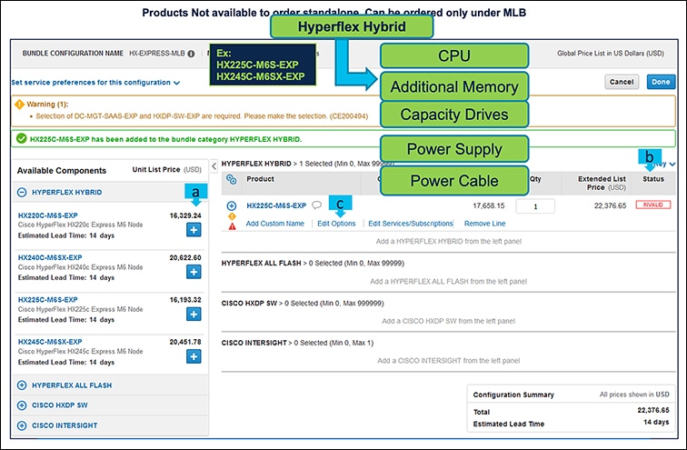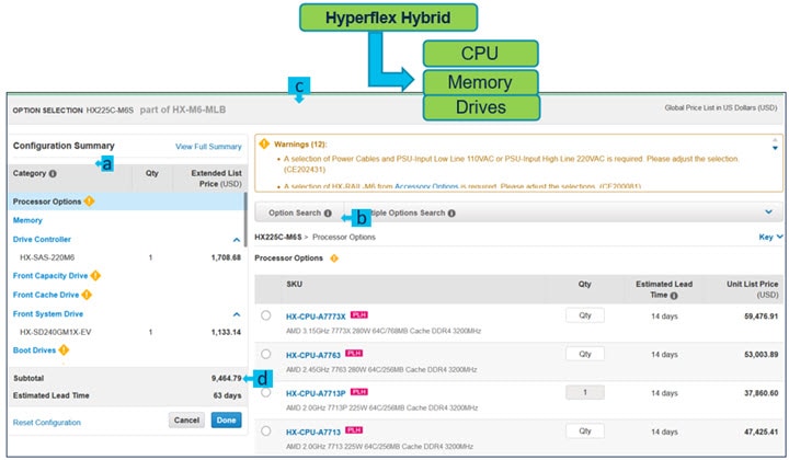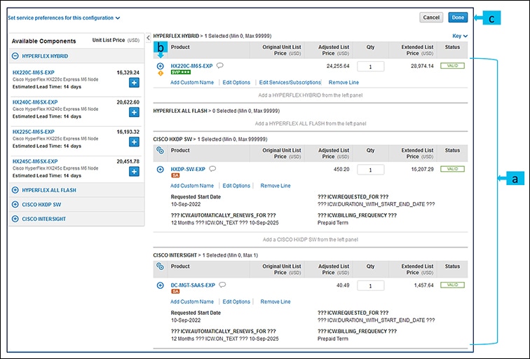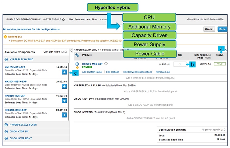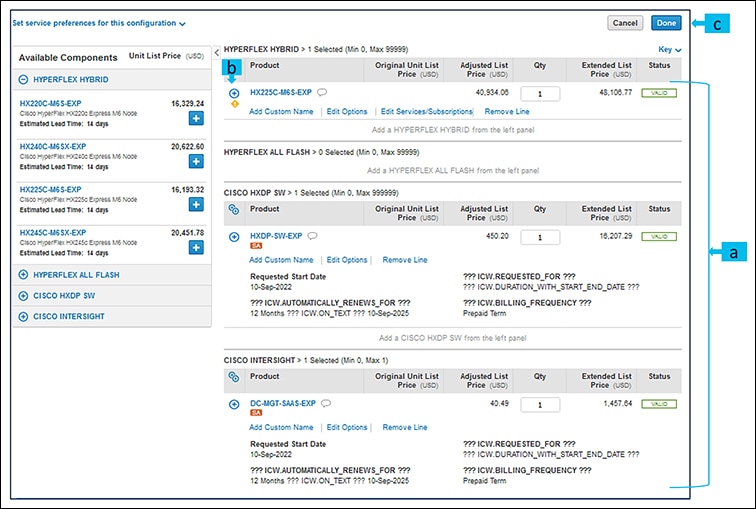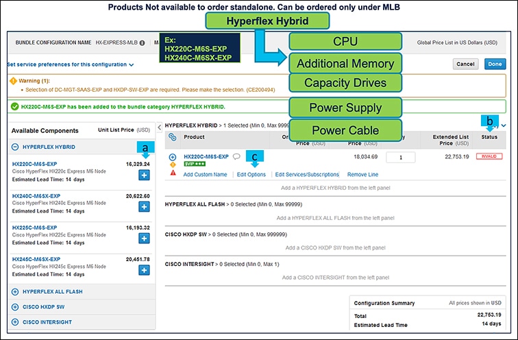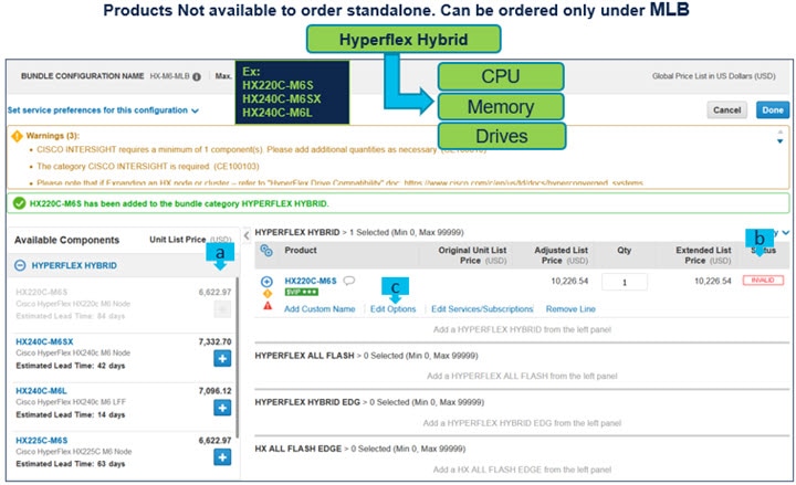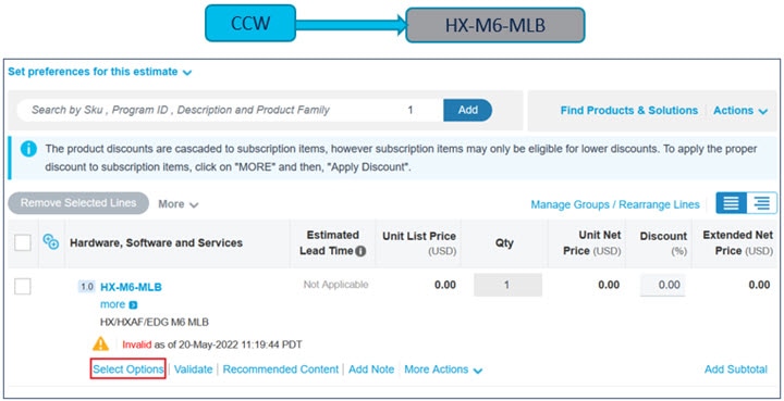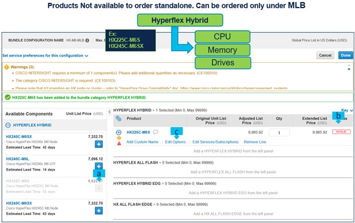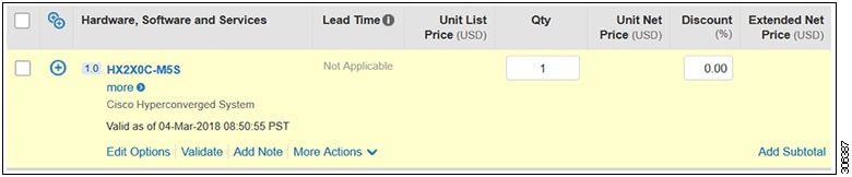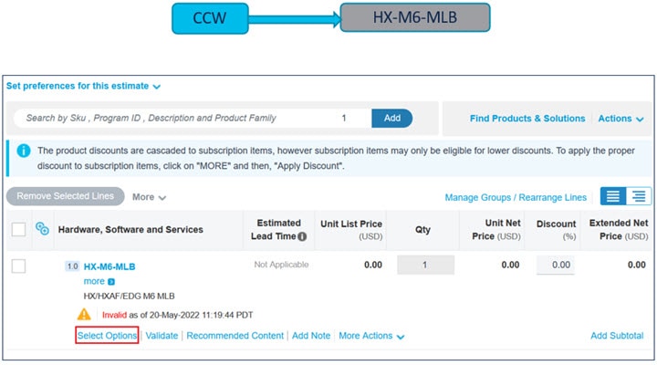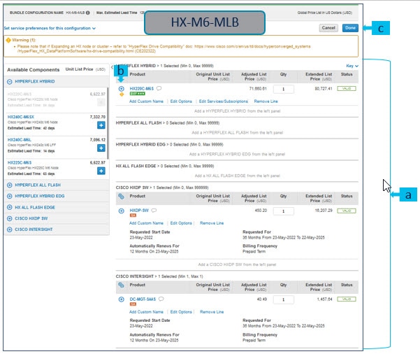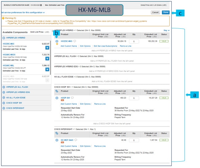 リスト ページで、SKU、PID、製品の説明、または製品ファミリ(HCIX-M7-MLB など)を入力して、この見積の基本設定を行い、 HX-M6-MLB注文する HCI 製品を検索します。
