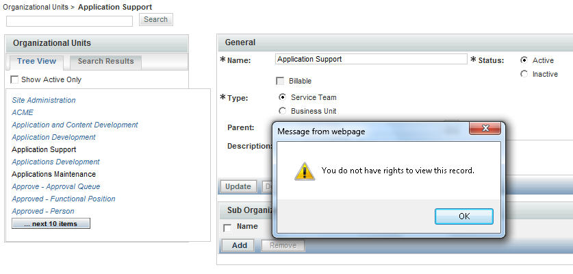 このロールは、同じ機能を提供しながら、各タイプの「すべてのオブジェクト」ではなく、特定の組織単位およびキューの作業にメンバが限定されるため、カスタム ロールにコピーする最適な候補といえます。組織でサービス チームを管理する役割は、複数の Service Team Administrator ロールに分割でき、ロールごとに異なるセットの組織およびキューを管理できます。組織が階層構造になっている場合は、親組織を特定の権限のオブジェクトとして指定するだけで十分です。子オブジェクトもすべて同じ権限になります。