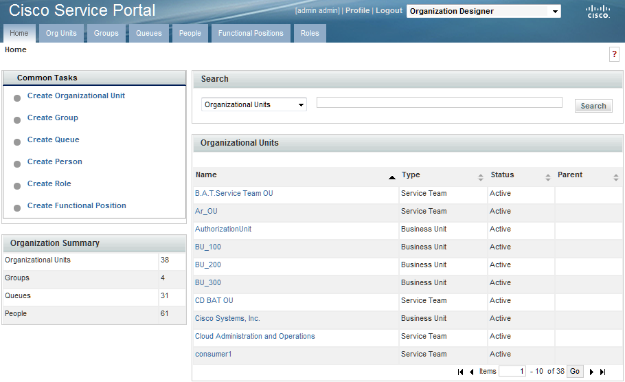 Organization Designer は、サービス組織を構築するための主要ツールです。このモジュールでは、Cisco Service Portal(Service Portal)実装の次のコンポーネントを設定および管理します。