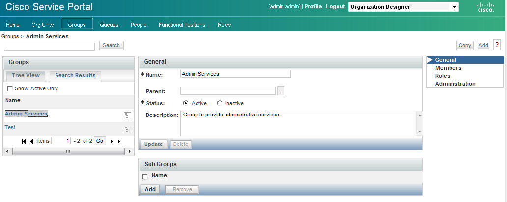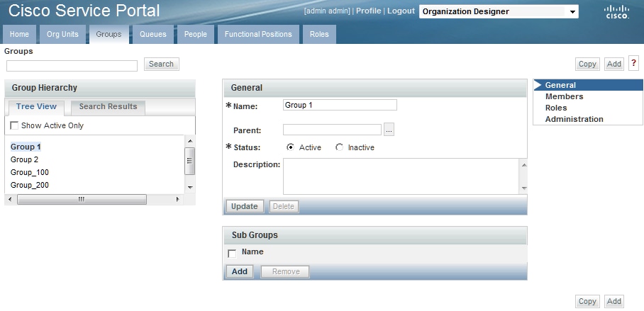 各組織エンティティ タイプには独自のホームページがあります。ここにアクセスするには、Organization Designer のホームページで対応するタブをクリックするか、または対応するタイプのエンティティを検索してから選択します。ホームページには、エンティティの「General」プロパティが表示されます。下に示すサンプル グループのように、その他のページがコンテンツ ペインの右に示されます。これらのページは、エンティティのタイプによって異なる場合があります。