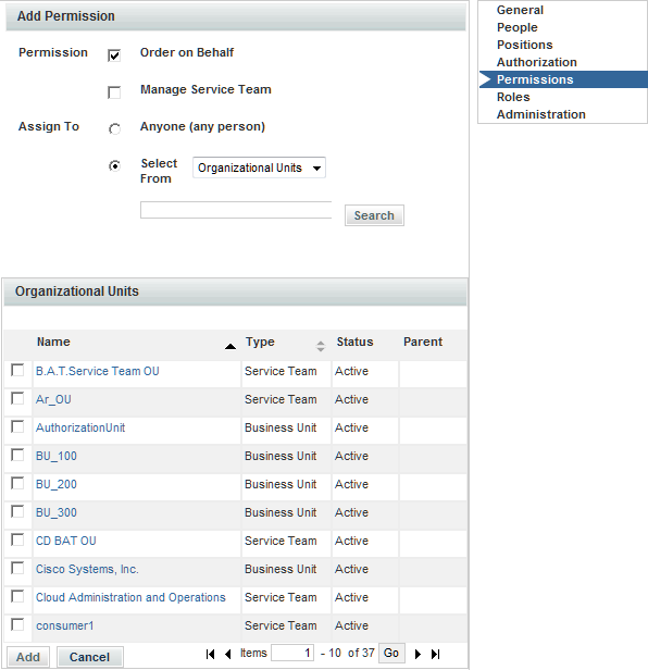 OU の権限を割り当てるには、[Add Permission] をクリックして、[Add Permission] ウィンドウを表示します。次に、追加する権限、および権限を追加するエンティティを指定します。