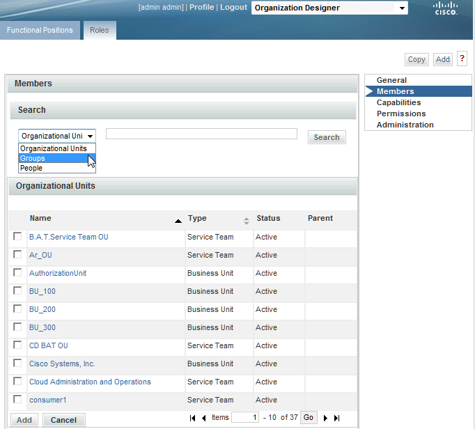 OU を個人に割り当てる:People コンポーネントの [Members] ページを使用して組織単位を追加すると、複数の OU を特定の個人に一度に追加できます。