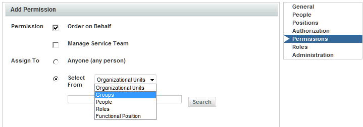 エンティティに対する管理権限は、指定した組織単位(その OU 内のすべての人にも継承されます)、役職、キュー、グループ、またはロールに割り当てることができます。また、権限を「Anyone」に割り当てることができます。この場合は、Organization Designer にアクセスできるすべてのユーザがそのエンティティの情報を変更できます。「Anyone」を追加する場合は、慎重に行う必要があります。