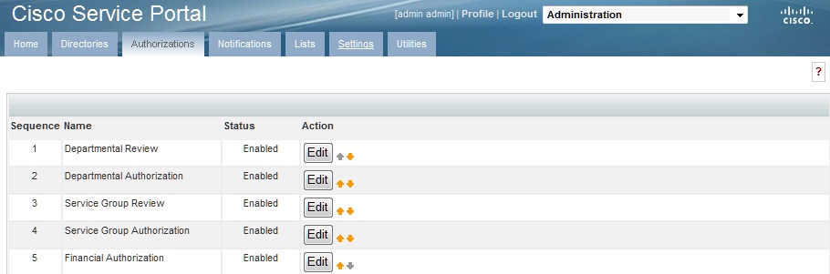 サイトごとに承認タイプを 5 つまでイネーブルにすることができます。実行の順序を変更するには、正しい順序になるまで [Authorization/Review] の右にある上矢印または下矢印をクリックします。