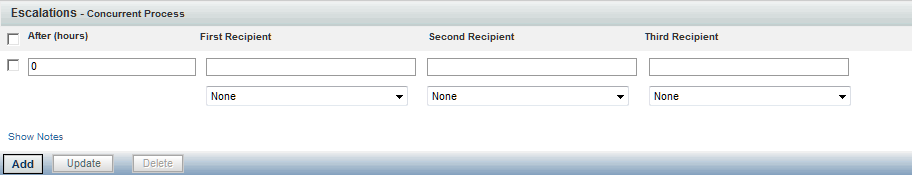 エスカレーション リストの各行は、層を表します。層はいくつでも指定できます。[Add] をクリックして、別の層を追加します。(対応するチェックボックスをオンにして [Delete] をクリックすると、層を削除できます)。