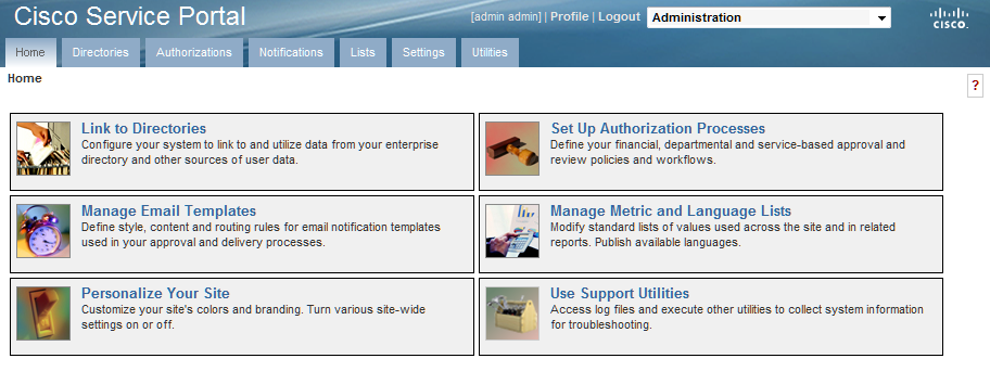 Administration の [Home] ページでは、ナビゲーション バーのタブまたはコンテンツ ペイン内のリンクを使用して、このモジュールのあらゆる部分にナビゲートできます。
