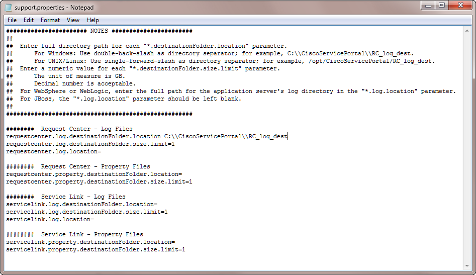 宛先フォルダのフル ディレクトリ パスを「*.destinationFolder.location」パラメータに対して入力します。Windows の場合は、二重バックスラッシュを使用してディレクトリを区切ります。たとえば、C:¥¥CiscoServicePortal¥¥RC_log_dest となります。UNIX/Linux の場合は、スラッシュを 1 つだけ使用してディレクトリを区切ります。たとえば、/opt/CiscoServicePortal/RC_log_dest となります。