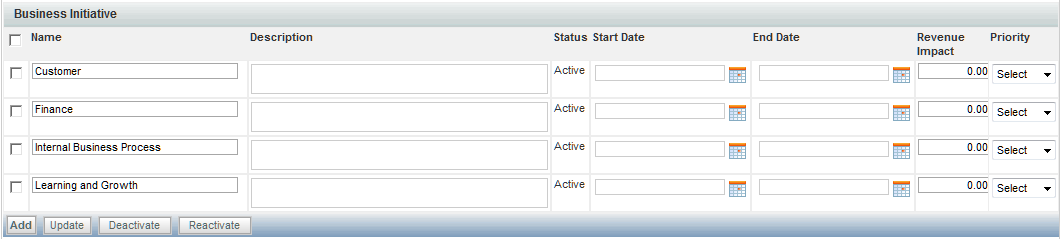 [Business Goals and Initiatives] リストは、サービス オファリングで使用される 4 種類のレポート分類(ビジネス カテゴリ、内部、ビジネス プロセス、ビジネス イニシアチブ)を設定するのに使用されます。 |