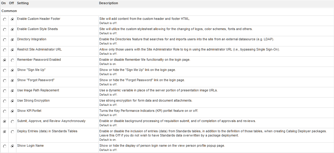 Administration モジュールを選択して [Settings] タブに移動します。[Customizations] ページが表示されます。次に示すように、[Common] の設定の中に [Enable Custom Header Footer] や [Enable Custom Style Sheets] などのパラメータがあります。