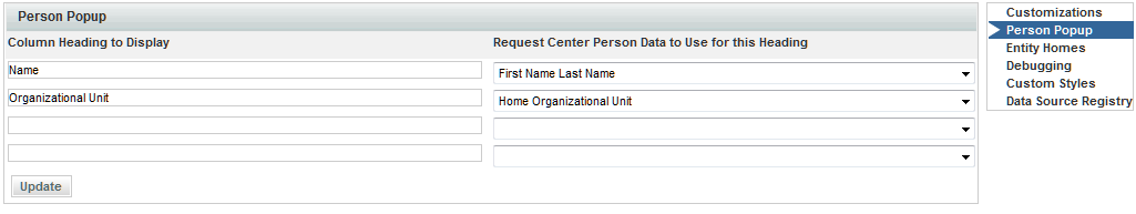 [Person Popup] では、ユーザが個人検索を実行したときに表示される [Person Popup] ウィンドウに、どのデータを表示するかを設定できます。個人検索は、次の場合に Request Center で実行できます。
